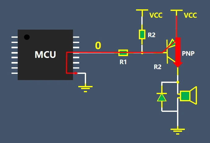 当MCU输出低电平时,三极管BE间的电压小于开启电压,这时三极管饱和导通。